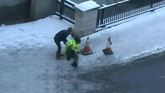 Lodowe i bardzo śliskiej nawierzchni w Norwich w Wielkiej Brytanii powoduje jakieś śmieszne wypadki.