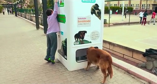 Turecka firma, Pugedon, był to wspaniały pomysł dla recyklingu butelek i pomoc dla bezpańskich psów w Stambule: automatyczne urządzenie, które dostarcza żywności i wody na psy, kiedy ktoś recyklingu butelkowanej wody z. Urządzenie posiada dwa gniazda, dla wody, która jest po lewej stronie i jeden dla butelki z tworzyw sztucznych. Woda jest oferowane bezpośrednio dla bezpańskich psów, Natomiast z każdej butelki, recykling, upadki i ilość karmy na kolejny wypad. Maszynę zainstalowano eksperymentalnie w określonych punktach w Stambule, Chociaż będzie żaden rząd nie kosztuje recykling obejmuje z powyższych jedzenie psów.