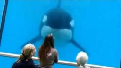 Wieloryb gra z gościem w akwarium SeaWorld Orlando.