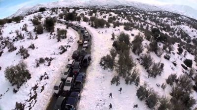 Wspaniałe zdjęcia lotnicze, które miały możliwość ciągnięcia Damoylakis Sokratesa z drone, nad śnieżne góry Psiloritis w korku. Dużych korkach tworzonych na drodze, To było ze względu na dużą liczbę turystów, którzy rzucili się do góry z powodu opadów śniegu.
