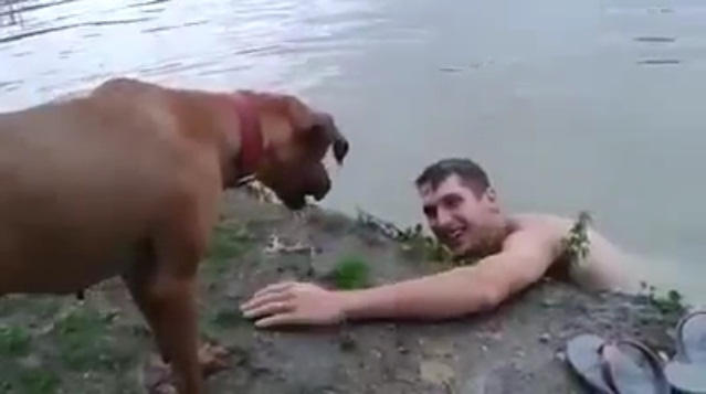 Młody w Rosji zanurza wody jeziora jak jego pies toru. Ale gdy jest wciśnięty do powierzchni, pies będzie się zapisać go i pomóc mu wyjść z wody. Podejrzany!