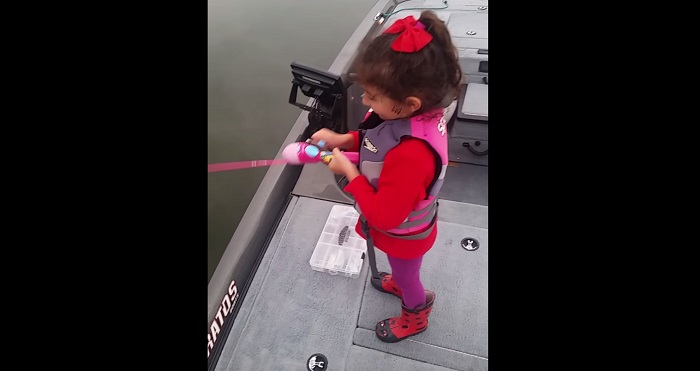 Podczas spaceru do połowów z jej tata, Mała dziewczynka będzie złapać dużego basu za pomocą wędki Barbie. Tata i córka są podekscytowani jak wyciągnąć rybę do łodzi. Piękne chwile.