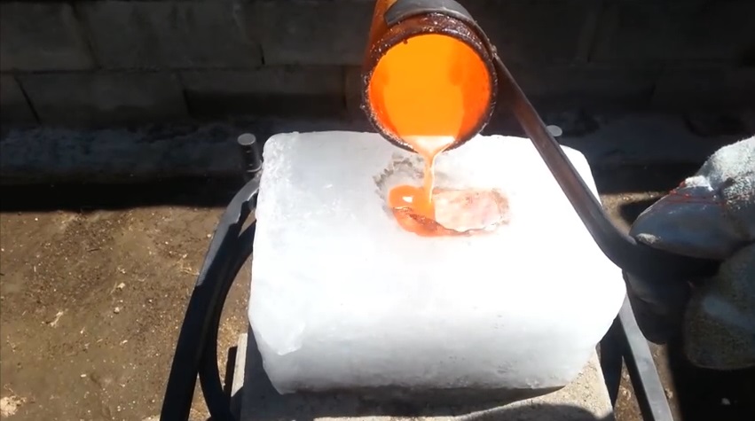 Kiedy topionego miedzi spadnie Lód topnieje zbyt szybko w swej istocie, jednocześnie metal szybko twardnieje w punktach styku, tworząc „korek” na powierzchni lodu. Ciśnienie pary rośnie tak szybko, w środku lodu, big bang, który tworzy.