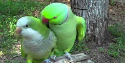 Papugę wooing prosi o pocałunki z ukochaną, że ignoruje.
