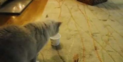 Kot sfinwnei głową w mały kubek jogurtu, i nie ma pojęcia, co zrobić żeby odkleić.