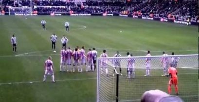 Gracz z Newcastle, Steven Taylor uwodzi bramkarz Stoke podczas uderzenia faul.