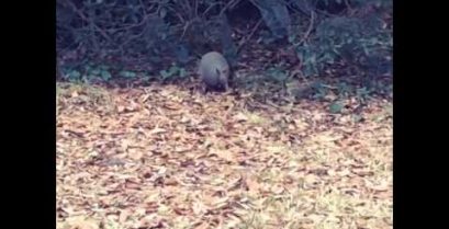 Pancernik zbiera liście, tańcząc w rytm utworu „Billie Jean” Michaela Jacksona., A wycofujące się powoli w kierunku krzewów.