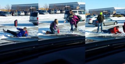 Jak on czeka na swoje dzieci ze szkoły, Przewodnik kroniki upadki przechodniów na chodniku pokryty lodem.
