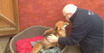Świt-urocze Fox w wildlife refuge Nuneaton i Warwickshire w hrabstwie Warwickshire w Anglii. Tutaj wstrząsać zadowolony jej ogon i cieszy się pieszczoty opiekun Geoff.