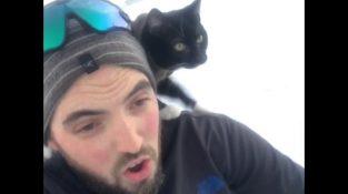 Człowiek leżący na sankach ze swoim kotem na ramionach. Wyjaśnia, że jego kot, Weston, Uwielbia jeździć na sanki, gdy pada śnieg.