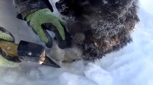 Na półwyspie Jamał w Rosji, Obaj mężczyźni znaleźć mały szczeniak uwięziony w lodzie.