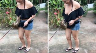 Ta bezczelna małpa prawie odsłoniła piersi turystki, po tym jak ściągnęła jej górę podczas wspinania się na nią. Brittany Bowman podróżowała z przyjaciółmi, kiedy odwiedziła Chiang Mai, Tajlandia, to visit the local primates.Already [...]