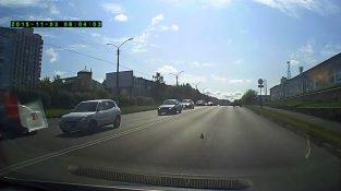 W mieście Nowoałtajsk Rosji, kitten chodzenie na środku drogi. Dwóch kierowców zostanie zatrzymane, aby usunąć z drogi.