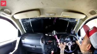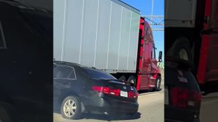 Wtorek, 30 listopada 2021 w pobliżu Chicago, Illinois, Na autostradzie I-294 jechała ciężarówka ciągnąca samochód pod przyczepą. Kierowca czarnego sedana wydaje się machać ręką [...]