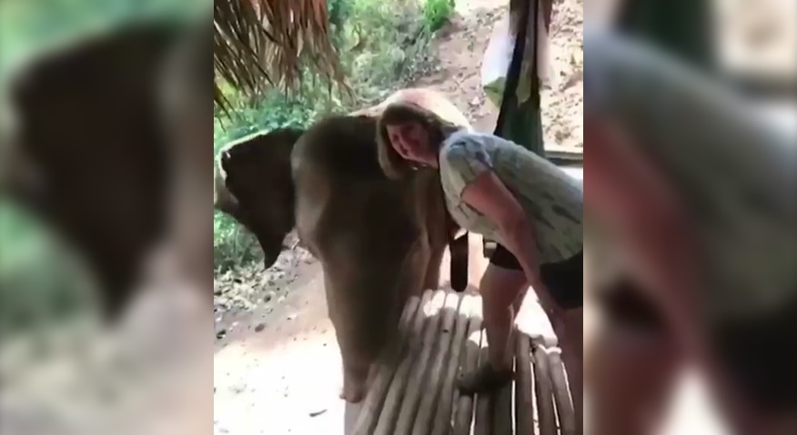 Um elefante violentamente empurra uma mulher que quer ser fotografado com ele.
