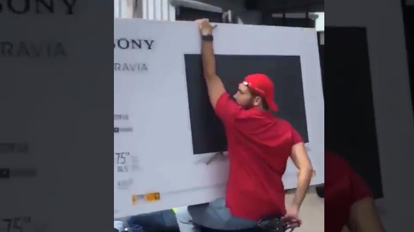 Dois homens em uma máquina, retornando a partir da compra de sexta Preto ter comprado uma televisão de 75 polegadas.