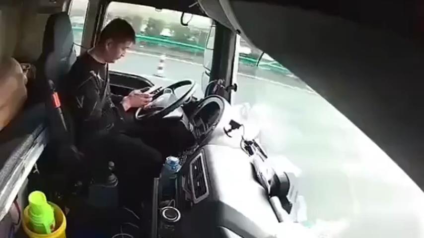 Um motorista de caminhão na China passa vários segundos em seu telefone celular sem prestar atenção na estrada. O resultado é perder o controle do veículo, que é eventualmente derrubado.