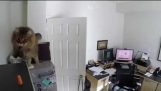 Um gato surpreso pula para trás nas molas de uma cama. Efeito cat-apult.