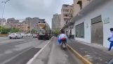 Motorista quebra enormes painéis de vidro com seu caminhão