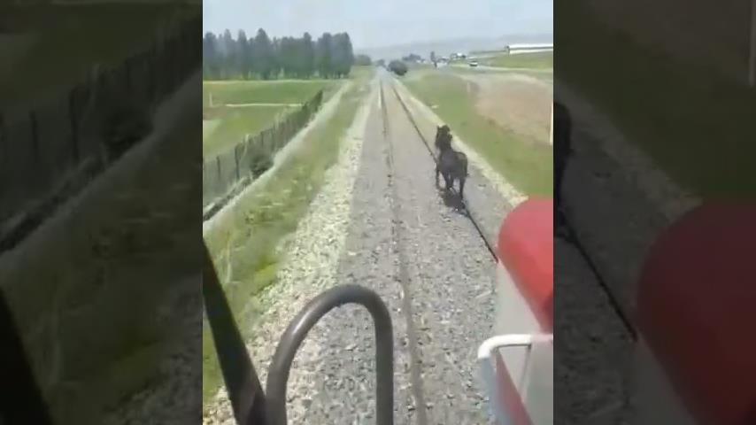 Um jovem cavalo está nos trilhos da ferrovia enquanto um trem se aproxima.