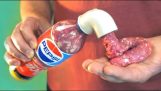Na Polónia, uma mulher e seu cachorro seguem uma passarela de madeira para subir ao céu... Esta é uma ilusão de ótica em um cais e os reflexos do céu nublado na superfície do lago.