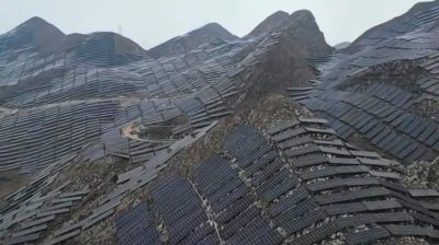 A China cobriu uma extensa cordilheira com painéis solares no interior de Gujjo. A área e os painéis solares olham para Google Mapas. O vídeo termina quando a bateria do drone termina.