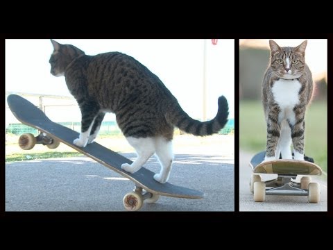 O Didga o gato usa um skate para um passeio em Coolangatta, Austrália. O proprietário do Robert Dollwet treina gatos e outros animais de mais de 33 anos.