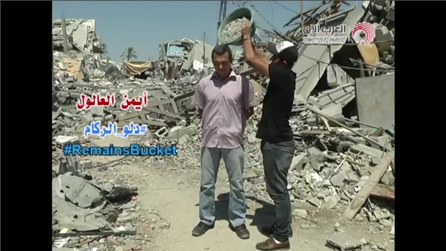 Em um esforço de sensibilização da opinião pública internacional, uma jornalista palestiniana em Gaza decidiu fazer um desafio diferente do balde de gelo. Usar o entulho das ruínas deixado para trás pelos bombardeamentos, em vez de um balde de água gelada que 'impõe' o desafio de balde de gelo, o jornalista 42chronos Ayman al Aloyl 'mpoygelwthike' com estas.