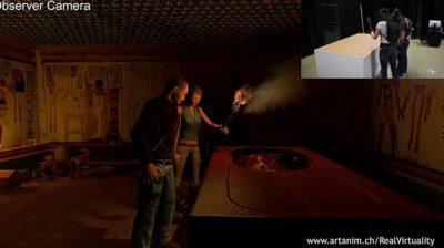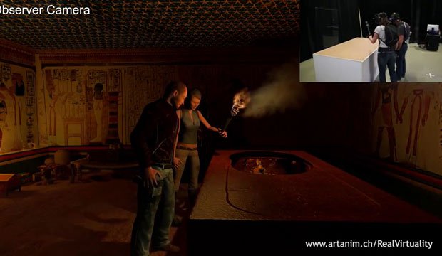 Equipado com um capacete de realidade virtual e um conjunto de sensores de movimento, pode interagir com todos os elementos ao seu redor. Neste caso, dois jogadores trabalham juntos para explorar a tumba do Faraó, uma experiência única. Esta plataforma é particularmente adequada para passeios educativos, museus e outros templos. A virtualidade Real será apresentada em agosto na tecnologia conferência SIGGRAPH, em Los Angeles.