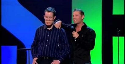 O ventríloquo Paul Zerdin escolhe alguém da platéia de ekmpompis comédia rochas e torna-se um fantoche humano