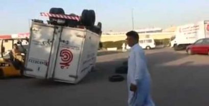 Trabalhadores no Paquistão tentando derrubar um caminhão.