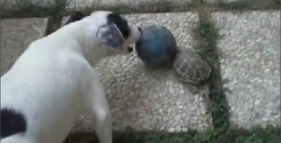 Uma tartaruga e um cão a jogar com uma bola. Quando o cão recebe a bola fora, a tartaruga a mordedura. Louis Suárez;