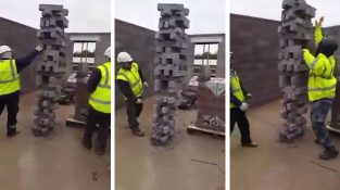 Durante as suas férias em um canteiro, três trabalhadores construir uma enorme torre de Jenga com grandes tijolos. O capacete é um acessório indispensável neste jogo.
