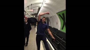 Dois jovens imitam seus sons com a boca de um jogo de pong ping, em uma estação de metrô em Londres.