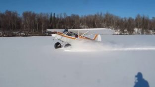 Em um lago congelado no Alasca, o piloto Bobby Breeden faz algumas tetake com seu avião.