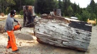 Só usando uma serra elétrica, o escultor Dave Lucas cria uma bela escultura em um tronco de árvore.