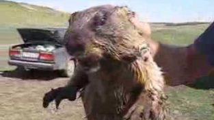 Marmot estepe, ou marmota (Marmota bobak) pego em uma população estável da região para o reassentamento na reserva central preto-terra de Belgorod. Pouring water from a marmot burrows – the most humane and safe method [...]