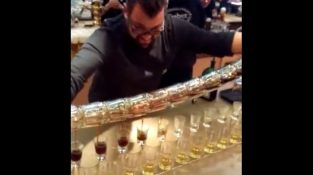 A técnica particular de um barman na cidade Altchaϊm da Áustria, para a preparação de 15 submarinos com Jägermeister.