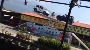 Original acrobático na China, com dois carros 4×4 balançando em uma plataforma metálica.