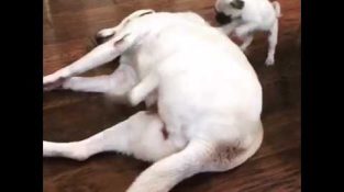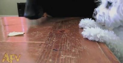 Só querem que o cão é para comer a patataki deitada na mesa. Mas seus sonhos destruídos quando chega o amigo alto.