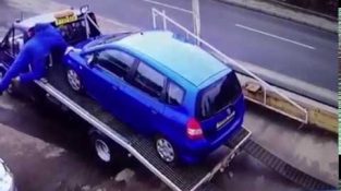 O motorista do caminhão de reboque tenta parar um carro em movimento.