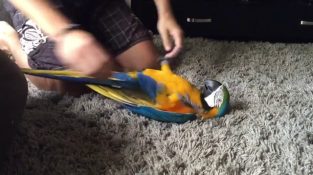 Este Ara papagaio é como um cachorro quando se joga com o chefe.