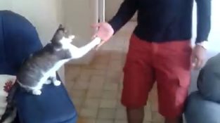 Um homem cumprimenta seu gato com um high-five e depois um soco (Soquinho).