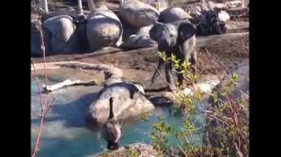 Em Hogle Zoo jardim em Salt Lake City Estados Unidos, um jovem elefante assediado por um ganso em sua manga, e tenta desafiar de forma alguma.