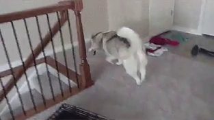 Um Husky explora a nova casa do, e descobre as escadas. O cão tenta descer as escadas para a primeira vez, mas não dá muito certo…