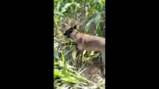 Na província de Shanxi, na China, um cão ajuda o dono do agricultor para cortar o milho em um campo.