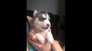 Um pequeno Husky recém-nascido gritando pela primeira vez, lembrando um lobo.