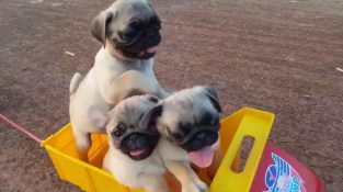 Um menino faz um passeio em sua bicicleta, puxando um trem com alguns filhotes globalmente.