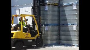 Um operador de empilhadeira encontra dificuldades ao tentar descarregar uma palete com garrafas.