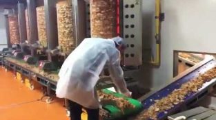 Fábrica prepara comida pronta com shawarma (shawarma), uma mistura de carne cozinhada em grades rotativas. A área é desconhecida, mas é provavelmente Arábia Saudita.